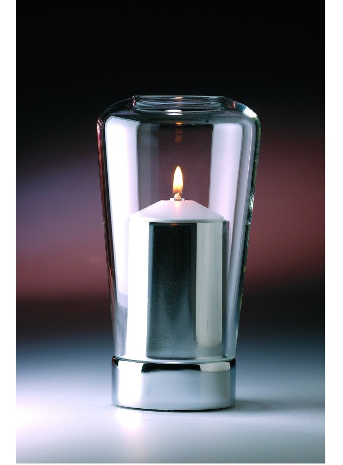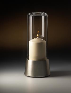 TARTUFO-lyhty, nikkelirunko/kirkas lasi. Täyttö 60A, paloaika 40tuntia. Korkeus 18cm.