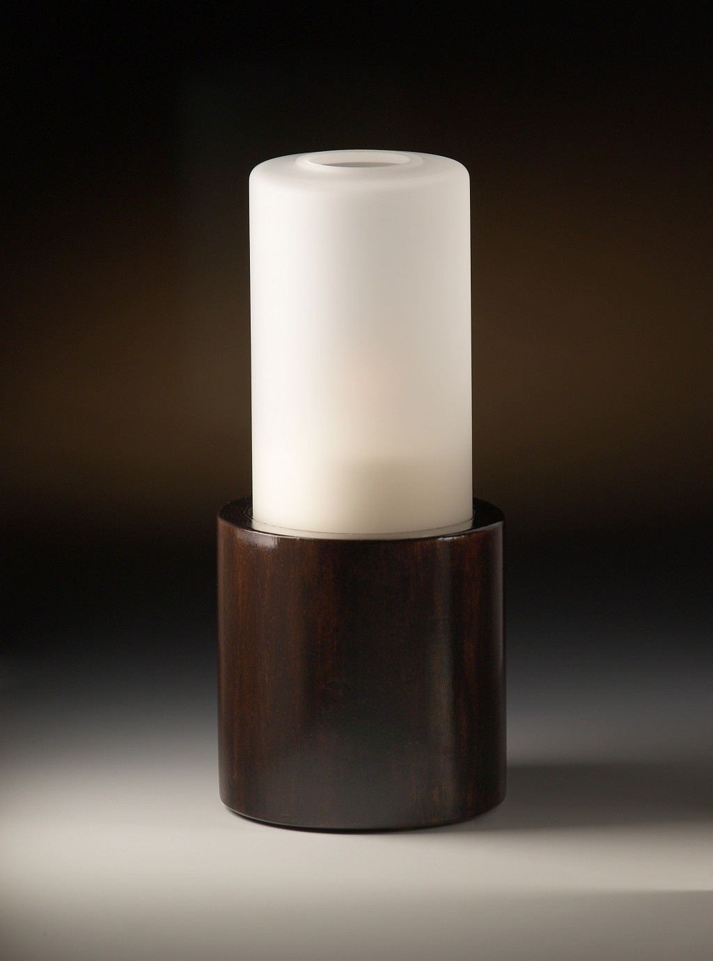 NOMAD-lyhty, tumma puulieriö runko /maitolasi. Täyttö 60A, paloaika 40tuntia. Kork.18cm.