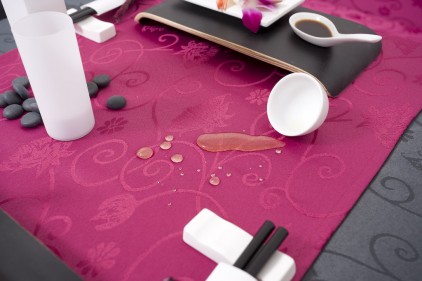 -RUOKA: Poista hillo, ketsuppi tai kastike liinasta irti lusikalla tai veitsellä. Pyyhi tarvittaessa kostealla liinalla (ilman puhdistusaineita!), mutta älä koskaan hiero tahraa.